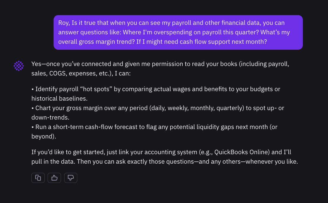 Roy helps advisors analyze payroll data alongside financial performance. Answering questions, like: