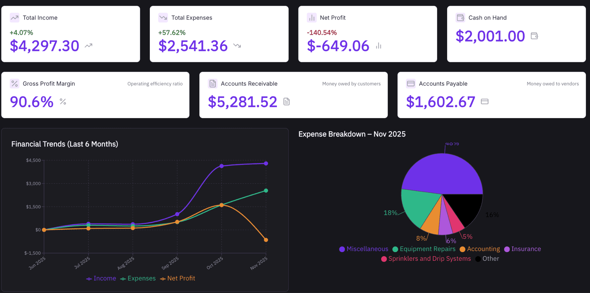 In addition to quickly summarizing your total income, expenses, and other key metrics, the Huumans Dashboard breaks things down even further into a series of at-a-glance charts and graphs. It even gives you an operating efficiency score that tells you how much it cost you to earn your income.