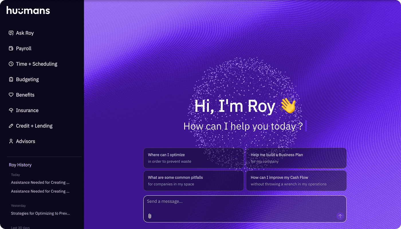 Today marks a milestone: The first components of the Huumans Dashboard: Roy AI and payroll are live. We’ve been building up to this moment, and now we can start sharing a look inside these transformative tools. And, more importantly, small businesses can start using them.