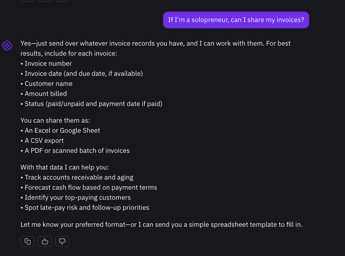 I was curious, would Roy, the AI advisor built into the Huumans Dashboard, work with me if I were a solopreneur who didn’t have QuickBooks or Xero? So, I asked if I could share my invoices instead. Roy is so helpful that he even offered to build me a template.